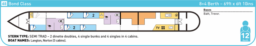 Our Premium 69ft Bond 12 Class narrowboats offer accommodation for up to 12 people.