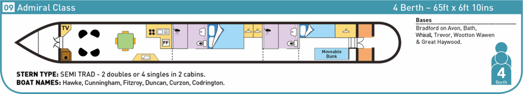 Our Luxury 65ft Admiral 4 narrowboats offer accommodation for up to four people.