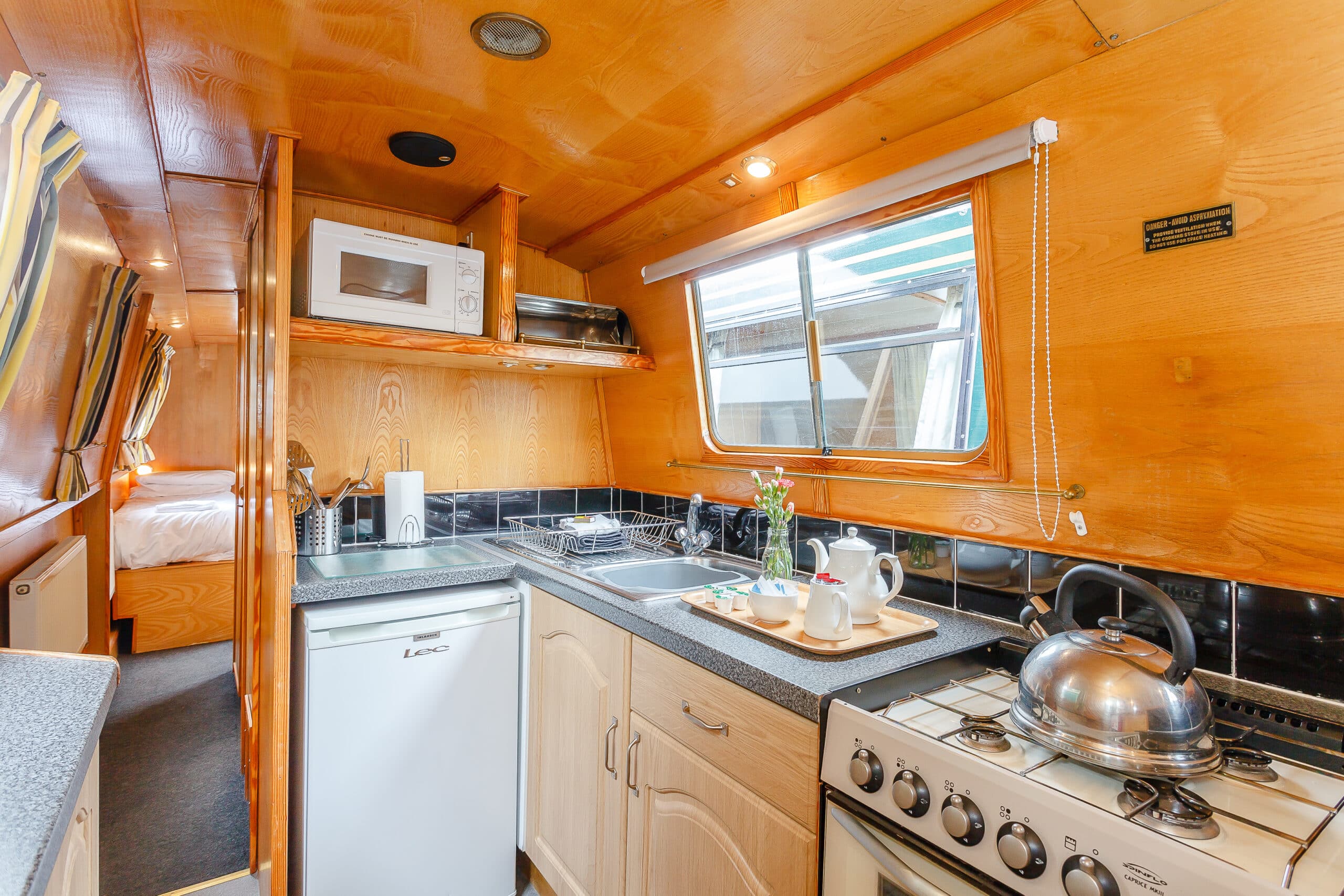 Our narrowboat galley kitchens are well equipped with all the essential items for a self-catering holiday afloat, including an oven, fridge, sink and cooking utensils.