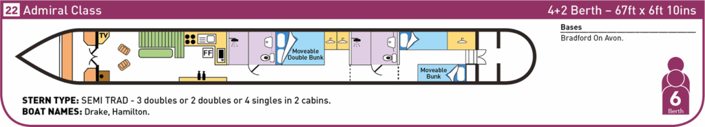 Our Luxury 67ft Admiral 6 narrowboats offer accommodation for up to six people.