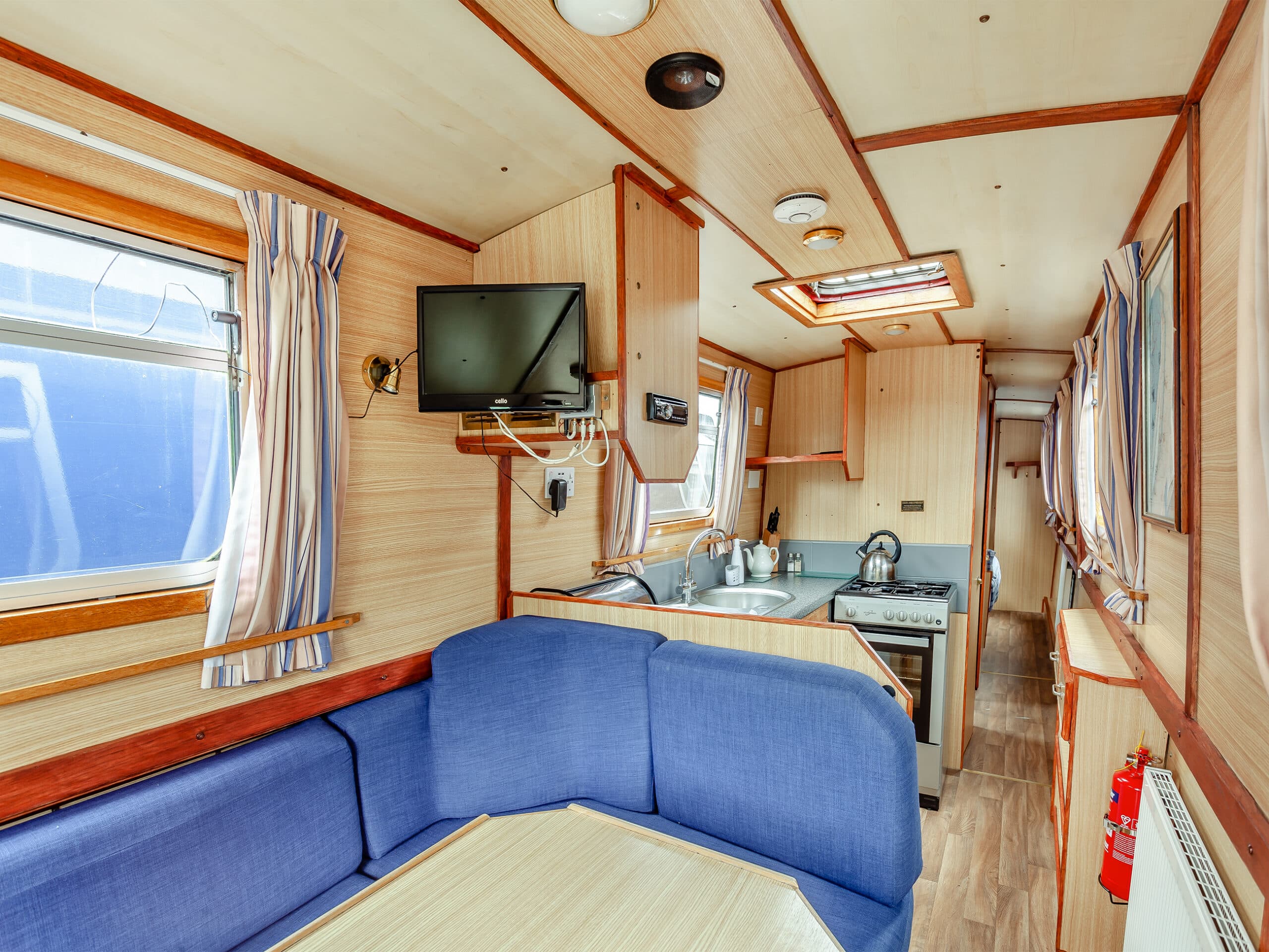 Saloon Spacious rear saloon with a sofa and removable table which can be converted into a double in the evening, if required. There’s also a TV/DVD player and a CD/Radio player in the saloon.