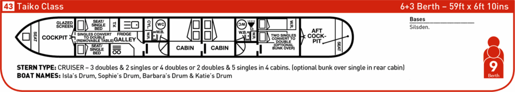 Our Premium 59ft Taiko Class cruiser stern narrowboats offer accommodation for up to nine people.
