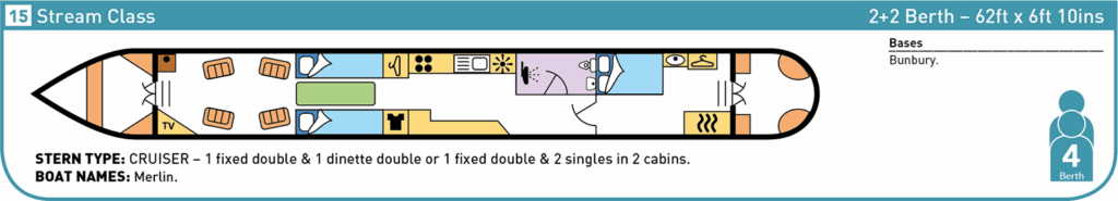 Our Premium 62ft Merlin cruiser stern narrowboat offers accommodation for up to four people.