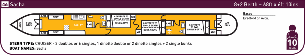 Our Premium 68ft Sacha cruiser stern narrow boat offers accommodation for up to 10 people.