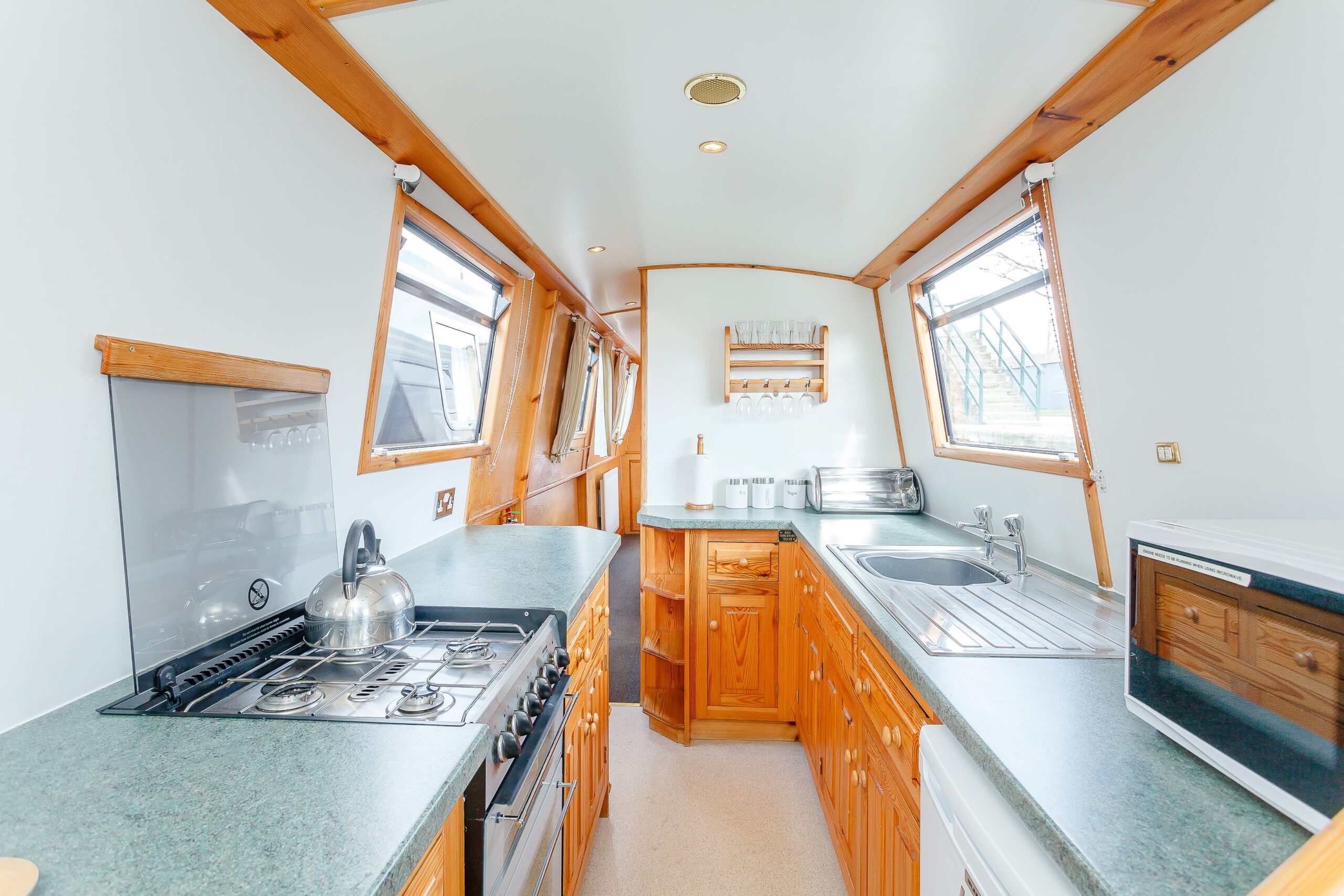 Our narrowboat galley kitchens are well equipped with all the essential items for a self-catering holiday afloat, including an oven, fridge, sink and cooking utensils.