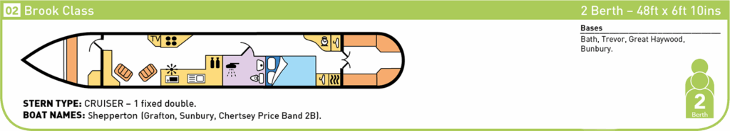 Shepperton is a 48ft narrowboat offering premium accommodation for two people. Our Brook Class boats have a cruiser stern.